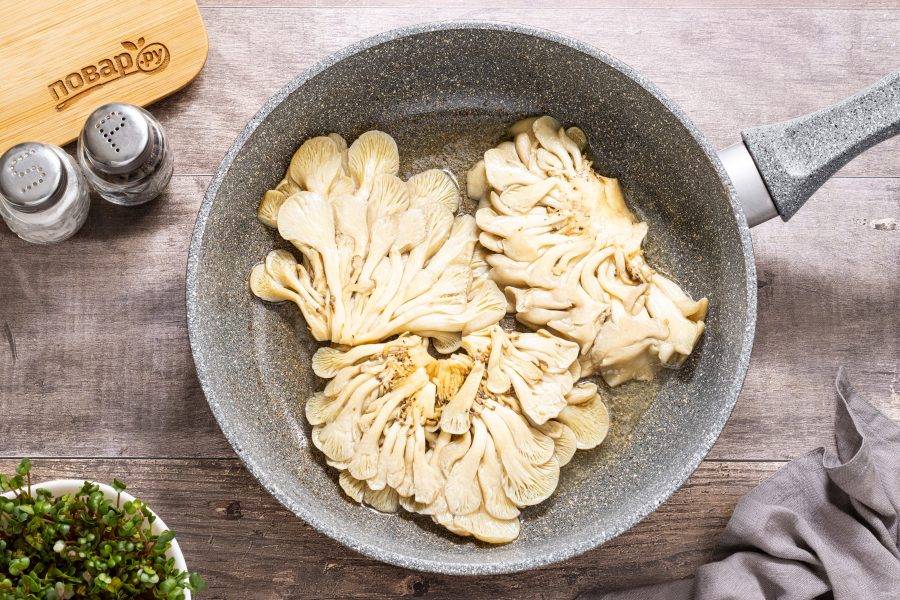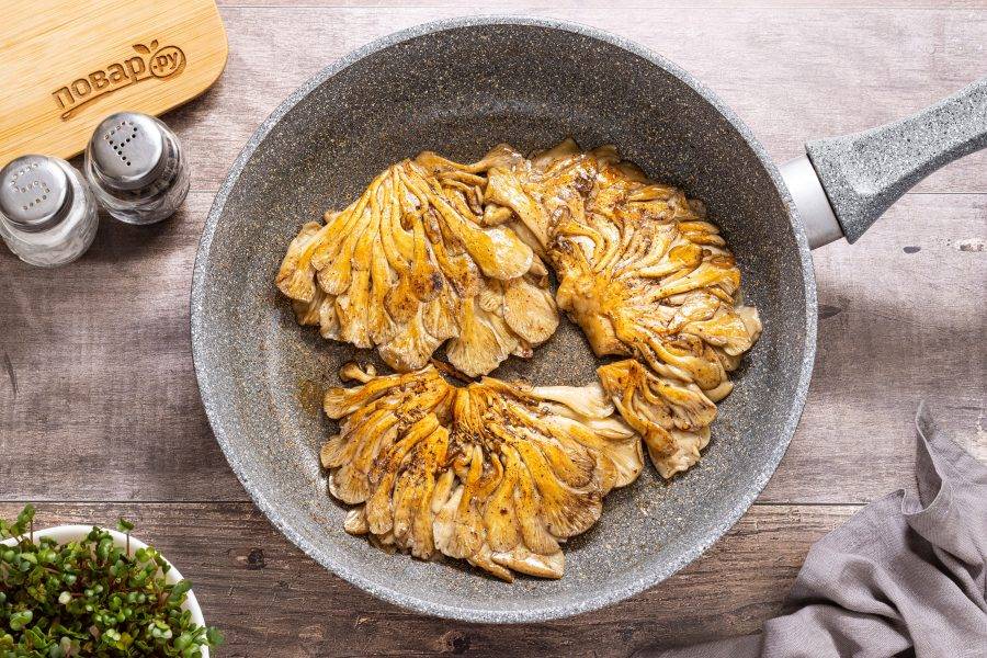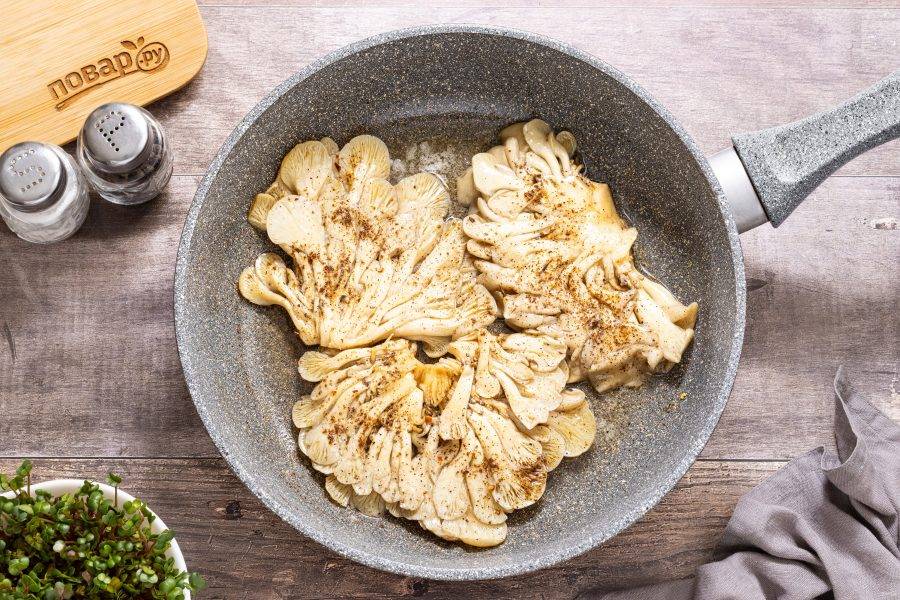 Затем посолите и поперчите вешенки. Аккуратно переверните.