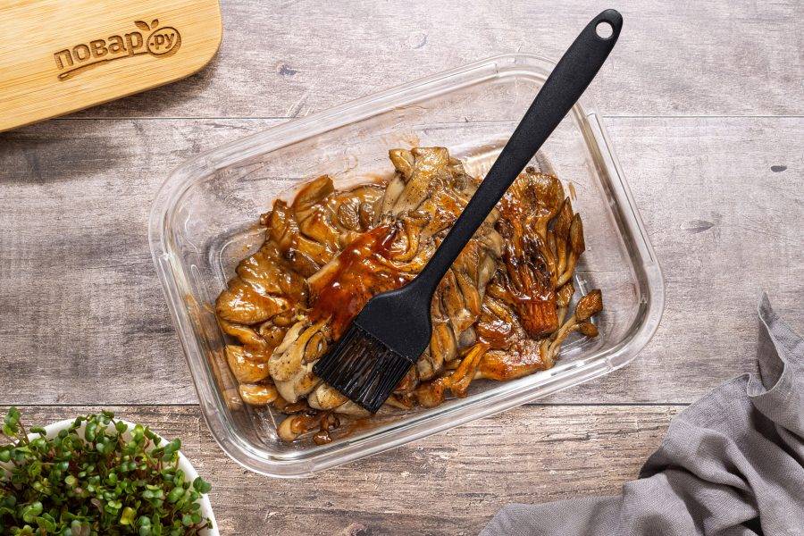 Немного остудите стейки из вешенок. Смажьте обильно соусом барбекю с двух сторон. Уберите в холодильник на полчаса промариноваться. Можно оставить на дольше.