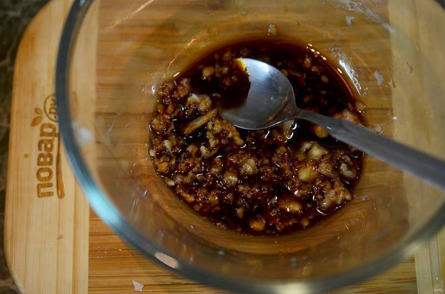 Для маринада смешайте соевый соус, лимонный сок, перец и чеснок.