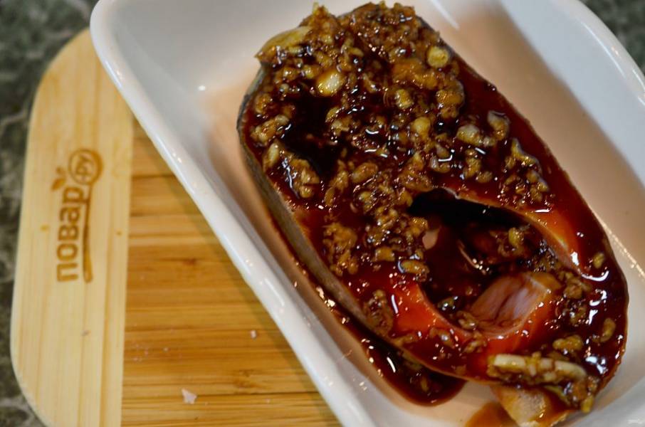 Стейк лосося разморозьте и выложите в форму для запекания.