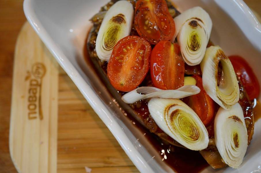 На стейк выложите помидоры с луком, добавьте каперсы. Посыпьте майораном. Если не хватает соли, посолите.
