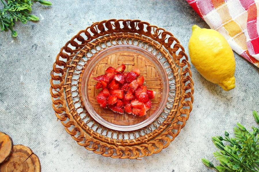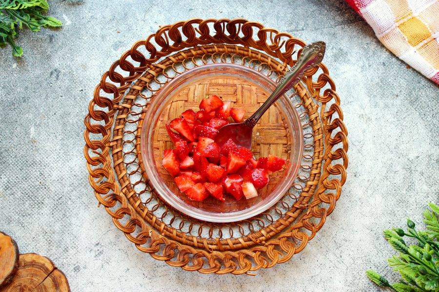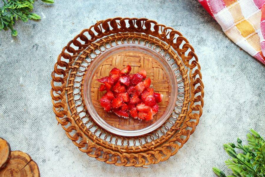 У клубники удалите зеленую часть и порежьте ее кубиком, выложите в миску.