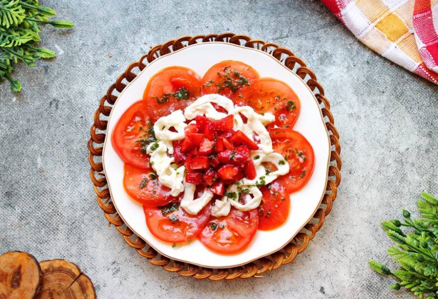 На первый взгляд странное сочетание клубники и помидоров вызывает изумление, но они прекрасно гармонируют. А нежный сливочный вкус страчателлы их отлично объединяет и дополняет. Берите идею!