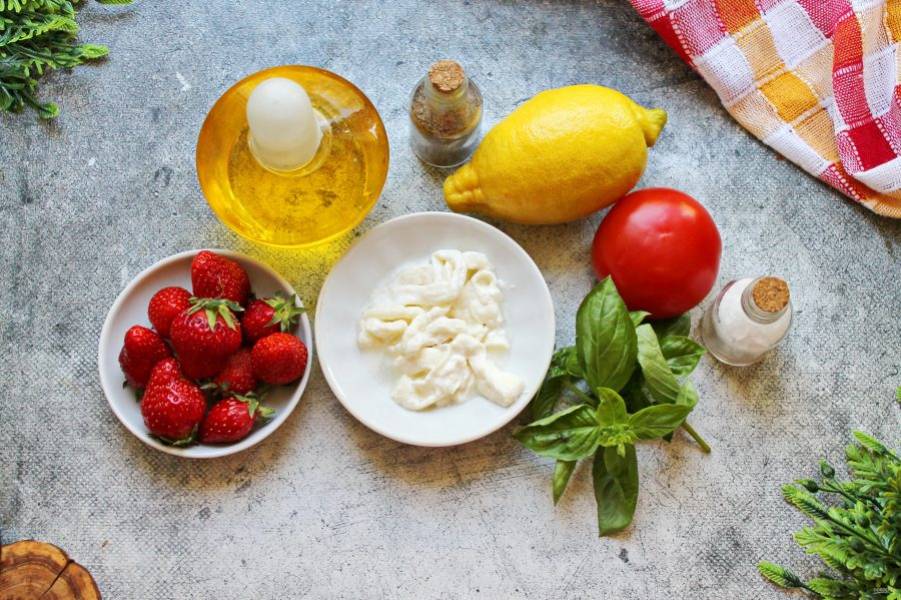 Подготовьте все необходимые ингредиенты для приготовления страчателлы с клубникой и томатами. Ягоды переберите и сполосните, разложите на полотенце, чтобы впиталась вода. Помидор вымойте и вытрите, базилик сполосните и хорошенько стряхните воду.