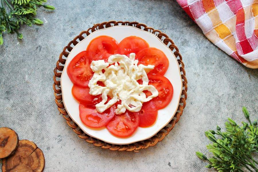 Нити сыра страчателла разложите на помидоры, разровняв.