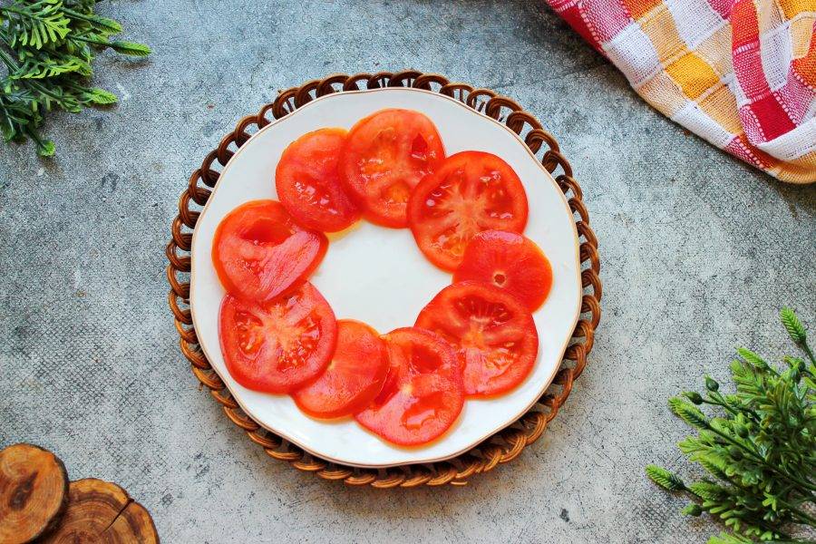 Помидор порежьте тонкими кружочками и разложите по кругу на сервировочное блюдо.