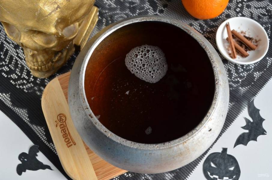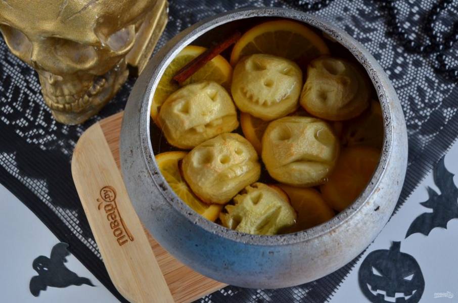 Напиток проварите 3-4 минуты. Положите в него головы страшилок и подайте теплым к столу. Угощайтесь!