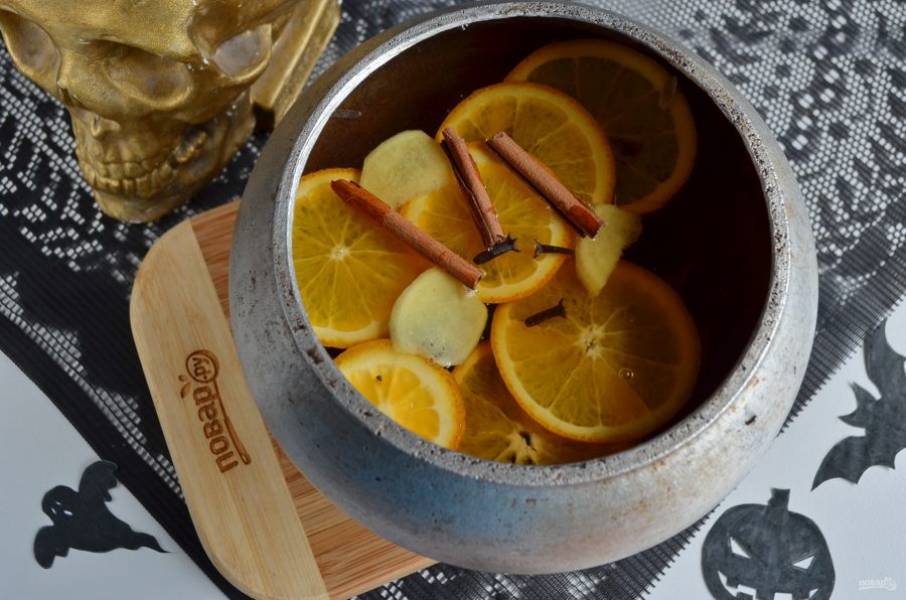 Положите палочки корицы, порезанный тонко корень имбиря, кружочки апельсина и гвоздику. Можно добавить душистого перца, если любите.