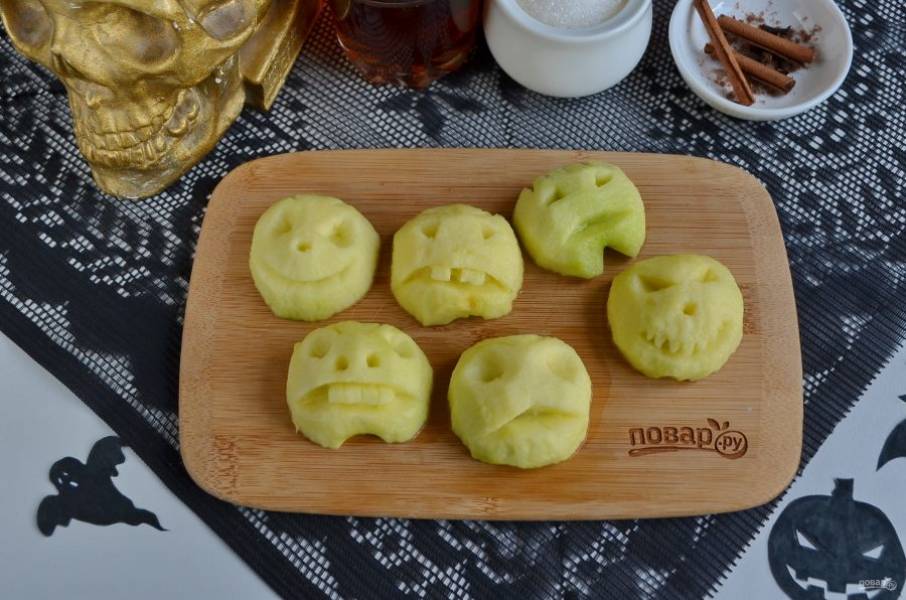 Сначала нужно сделать страшилок. Для этого порежьте яблоки на половинки. С каждой половинки удалите сердцевинку и кожуру. Вырежьте глаза, нос, рот. Фантазируйте, чем страшнее — тем интересней! Готовые заготовки окуните в смесь лимонного сока и соли, чтобы не потемнели. Положите на пергамент и запекайте в духовке при 250 градусах 2 часа. Но время может быть значительно уменьшено, смотрите по возможностям своей духовки. Главное, чтобы головы страшилок сморщились и ссохлись.