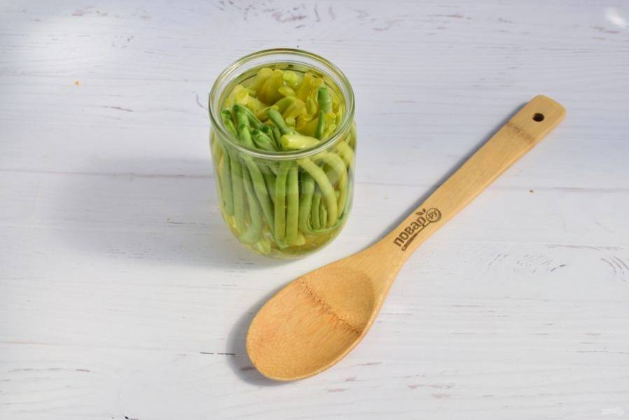 3. Заложите стручки плотно в стерилизованные полулитровые банки. В кастрюле соедините кипяток, соль, варите пару минут, снимите с огня, влейте уксус. Теплым рассолом залейте стручки в банках.