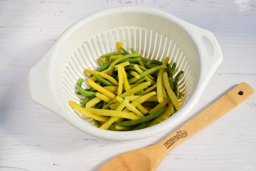 2. Залейте фасоль кипятком на 5 минут, откиньте на дуршлаг, обдайте холодной водой.