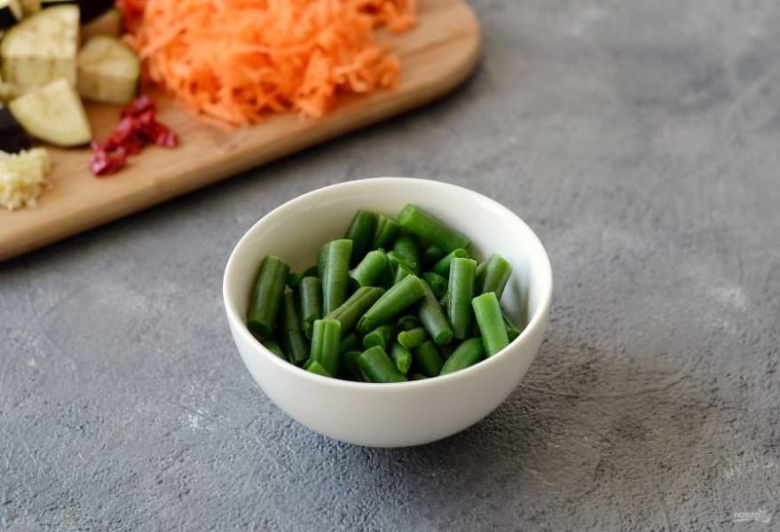 Если используете свежую стручковую фасоль, то отрежьте кончики с двух сторон, затем нарежьте на кусочки по 2-4 см. Замороженную фасоль просто разморозьте.