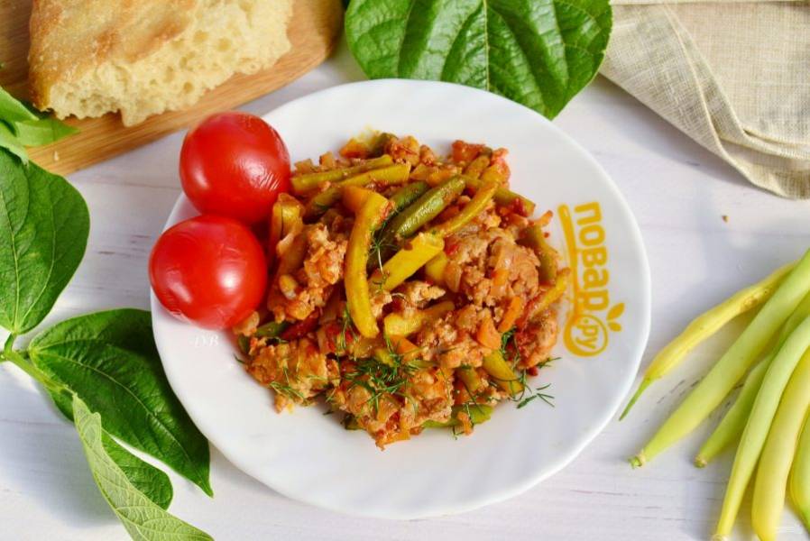 Предлагаю еще одно простое блюдо из полезной стручковой фасоли. Мясной фарш из индейки с овощами тушится в красном вине и аджике. Простое, но очень вкусное и сытное, в меру острое и ароматное рагу.