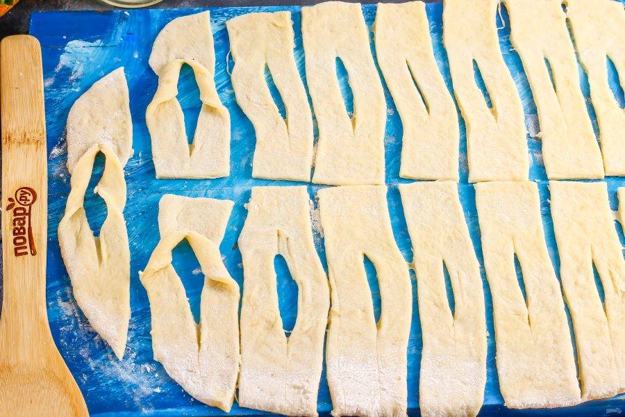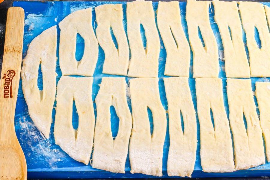 Нарежьте тесто прямоугольниками, внутри каждого из них сделайте надрез.