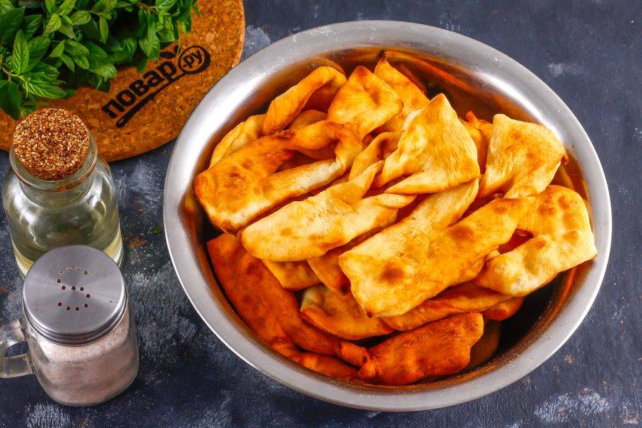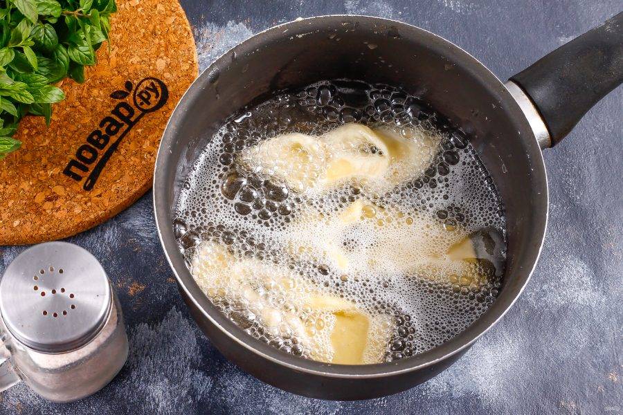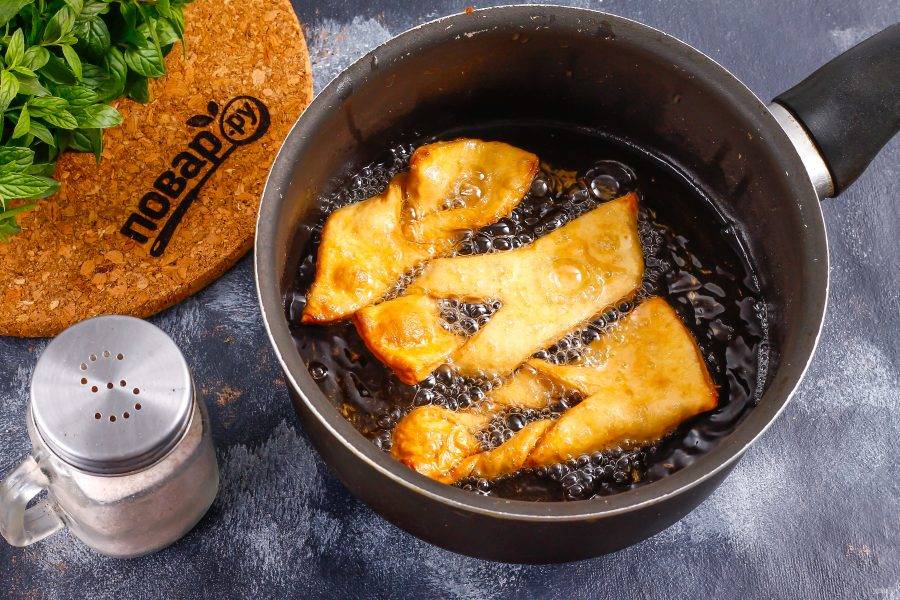 Прогрейте в казане или ковше растительное масло и выложите в него заготовки только тогда, когда оно будет кипеть. Обжарьте около 1 минуты.