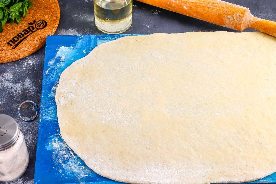 Отделите часть теста и раскатайте ее в округлый пласт, подпыляя рабочую поверхность мукой.