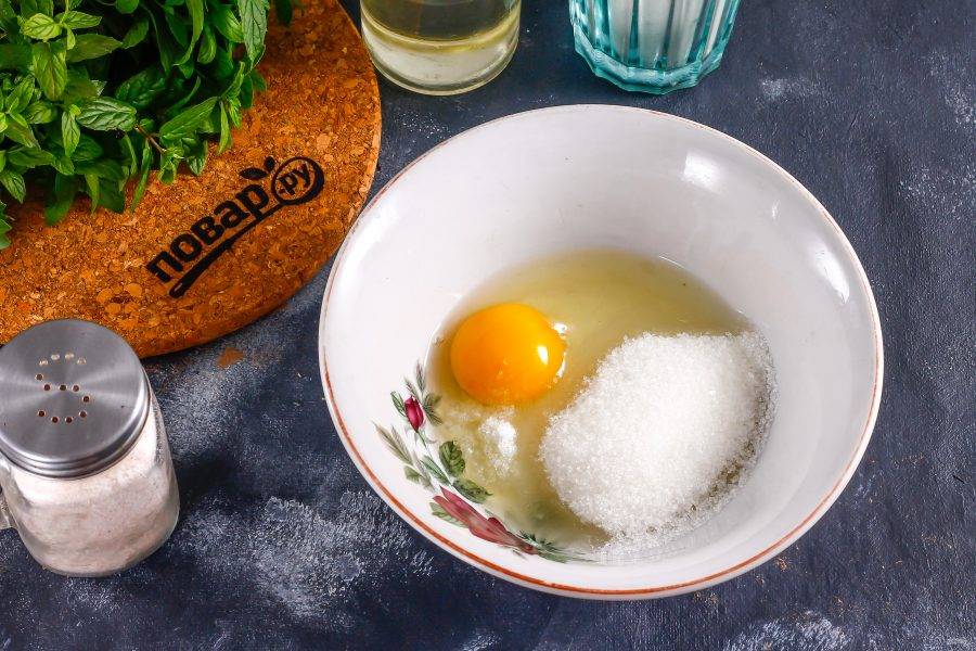 В глубокую емкость вбейте куриное яйцо, всыпьте сахарный песок и соль, влейте воду и взбейте.