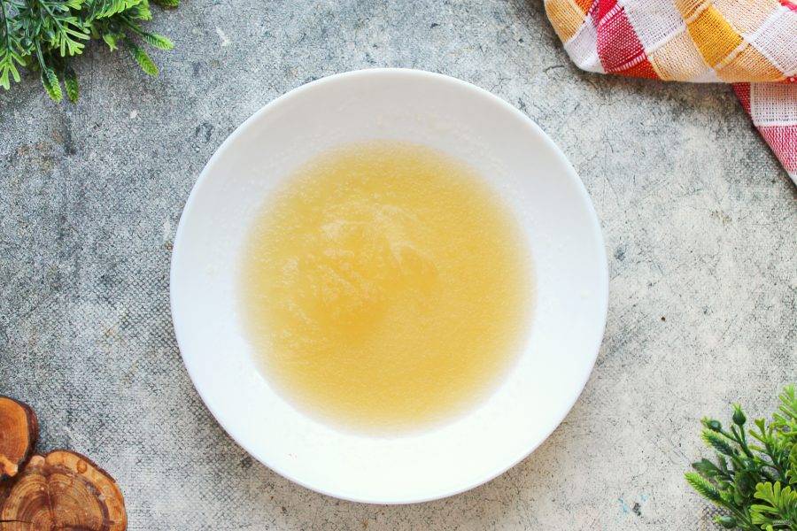 Мясо и курицу остудите в бульоне и достаньте. Бульон процедите через мелкое сито, овощи больше не понадобятся. Желатин замочите в 200 миллилитрах холодного бульона и оставьте до набухания. На это уйдет от 30-60 минут, в зависимости от его вида.