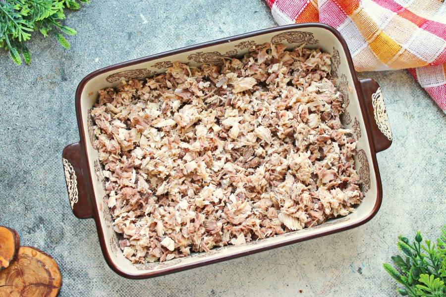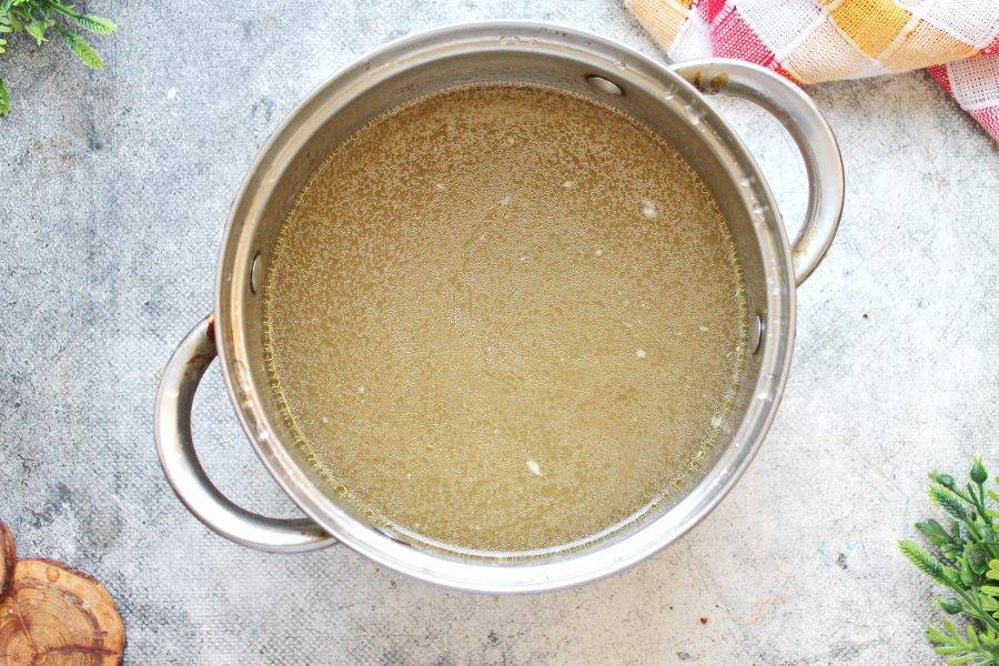 Желатин распустите любым удобным способом, я это делаю в микроволновой печке. Немного нагрейте бульон и добавьте желатин, перемешайте.