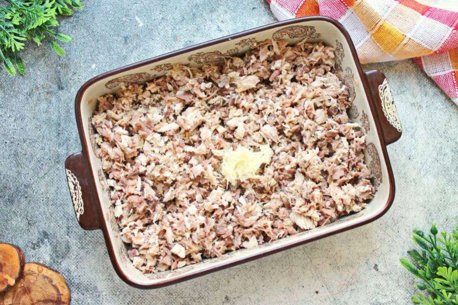 Чеснок почистите, измельчите и добавьте в форму с мясом.