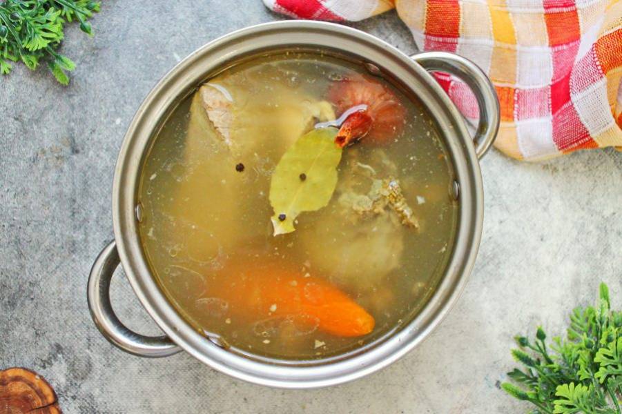 Промойте мясо еще раз, выложите в кастрюлю с толстым дном, залейте холодной водой и поставьте на средний огонь. Доведите все до кипения и убавьте огонь. Убавьте огонь и варите 30 минут, снимая пену. Морковь и репчатый лук добавьте в кастрюлю и варите, не накрывая крышкой, на маленьком огне в течение 2-2.5 часов. Мясо должно очень хорошо свариться.