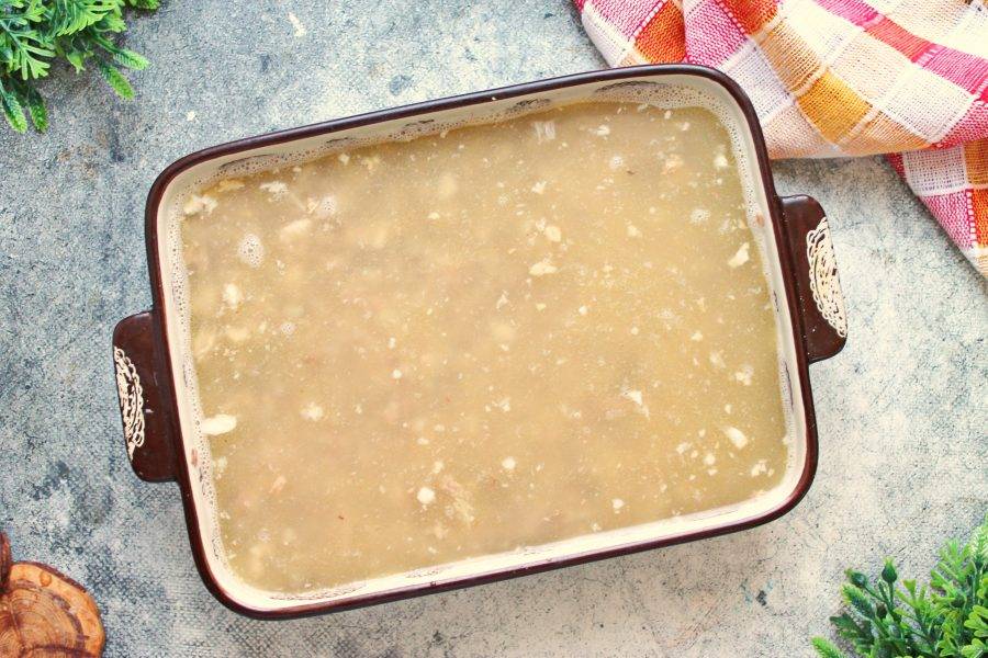 Залейте мясо с чесноком бульоном с желатином и перемешайте. Поставьте в холодильник на 5 часов, до полного застывания студня.