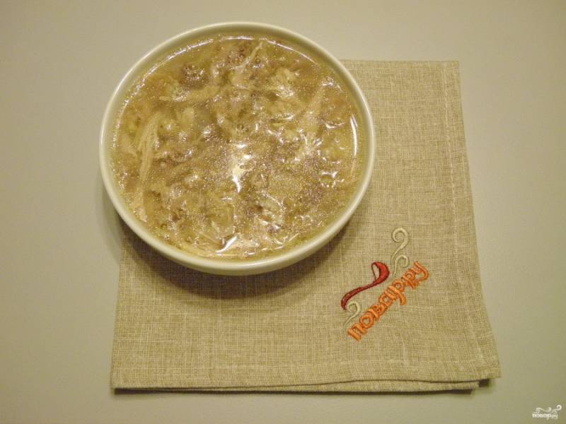 Залейте бульоном мясо, поставьте в холодильник на 4-5 часов для застывания.