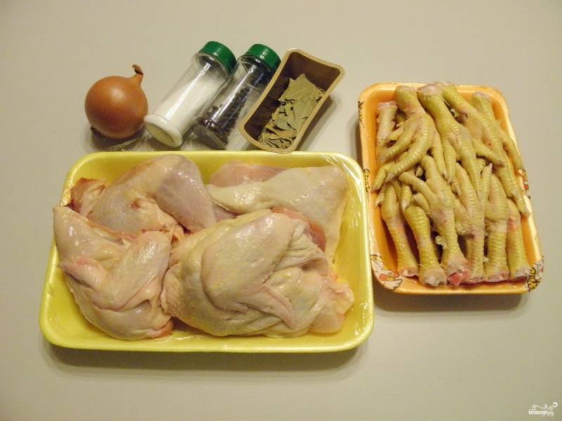 Подготовьте продукты для холодца. Можно взять одну большую курицу или части тушки. Я взяла рубленого цыпленка без спинки, только мясную часть. Лапки нужны для того, чтобы холодец застыл, в них содержится много желирующего вещества.