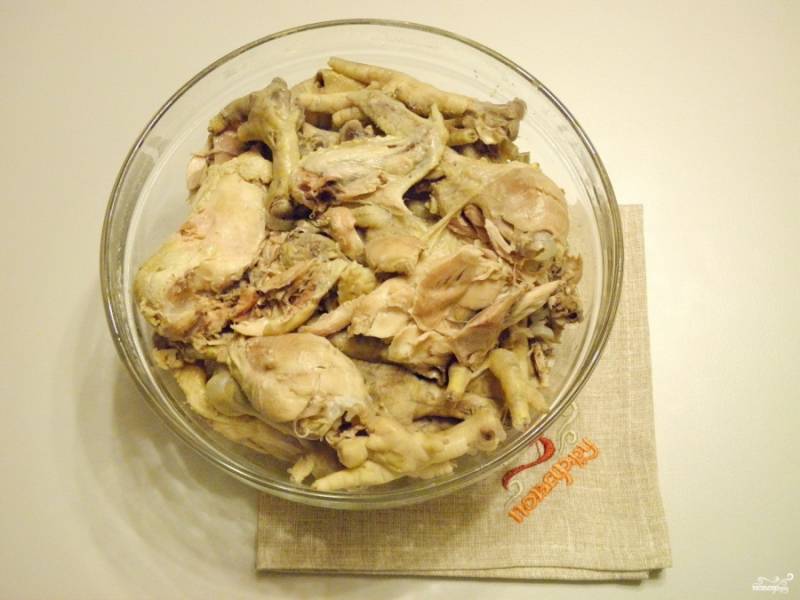 Сложите лапки в глубокую миску, залейте их кипятком, оставьте на 10 минут распарится. Делается это для того, чтобы потом было легче снять с них кожу.