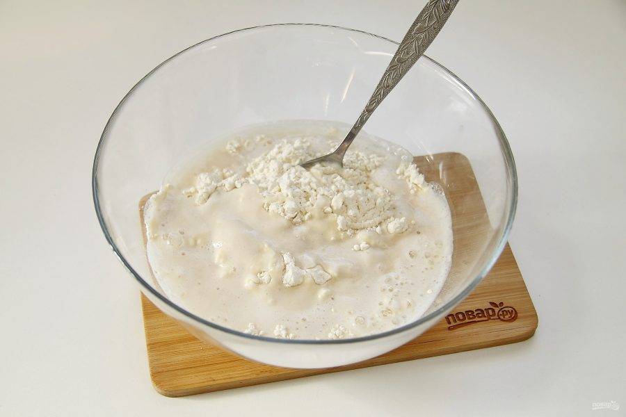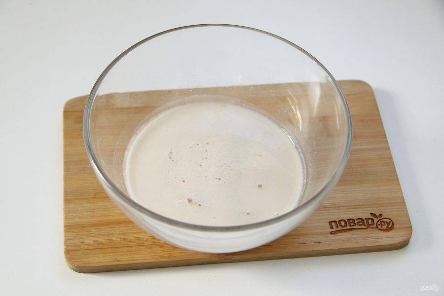 В миске соедините теплую воду, сахар и дрожжи. Хорошо перемешайте и оставьте до появления характерной шапочки.