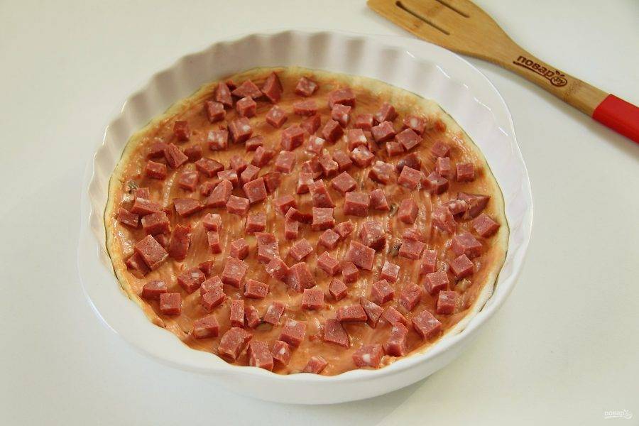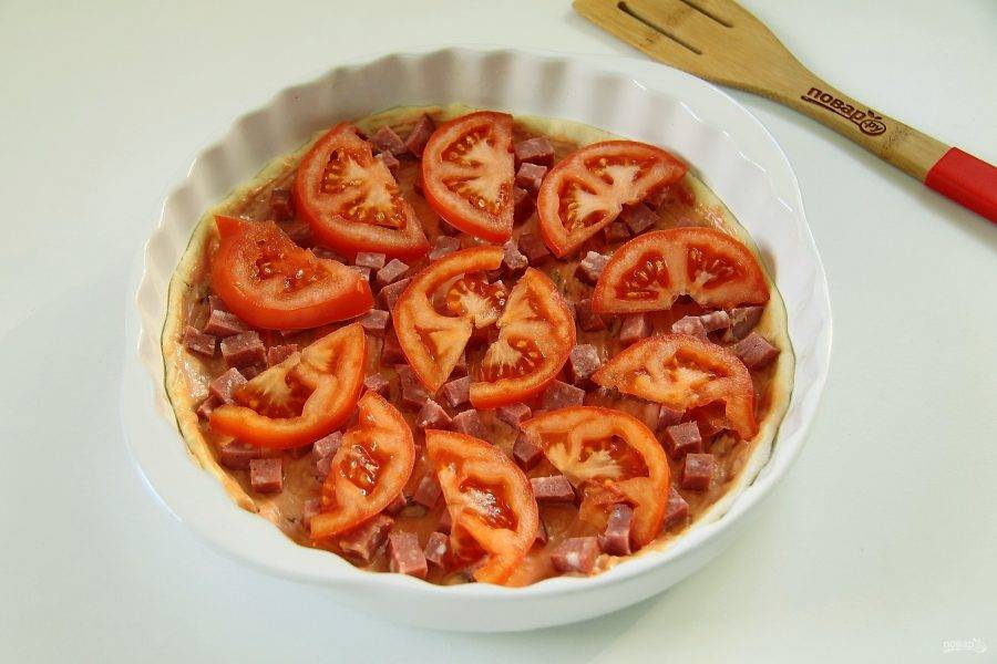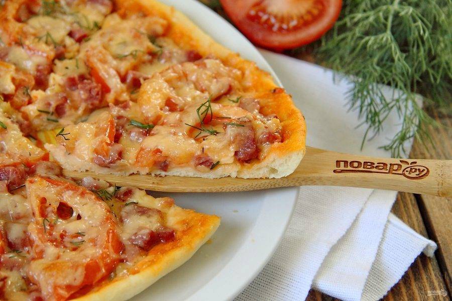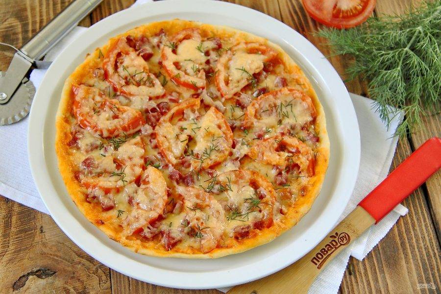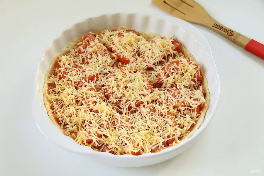 Посыпьте верх пиццы тертым сыром и выпекайте при температуре 230 градусов около 7-8 минут.