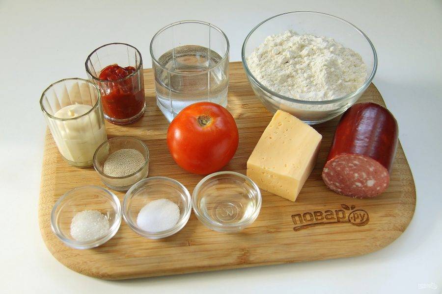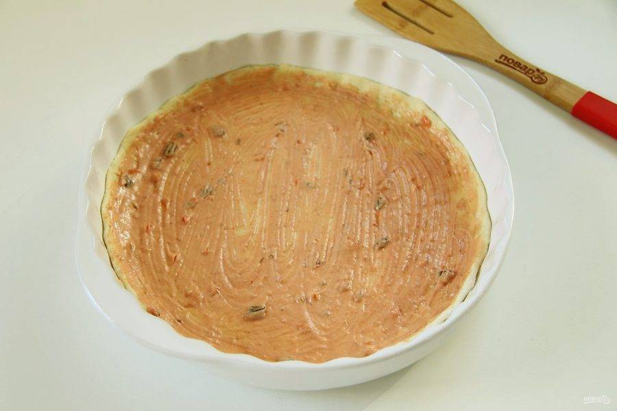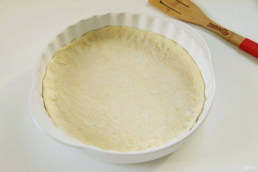Из данного количества выходит одна большая квадратная пицца или две круглые среднего размера. Я делаю круглые пиццы, поэтому делю тесто на две части и поочередно раскатываю каждую в форме круга, толщиной около 3 мм и переношу в смазанную маслом форму, формируя небольшие бортики.