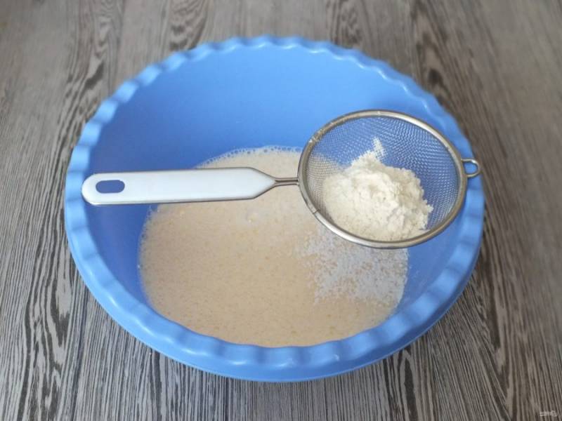В два приема, через мелкое сито введите муку, каждый раз перемешивая до однородного состояния.