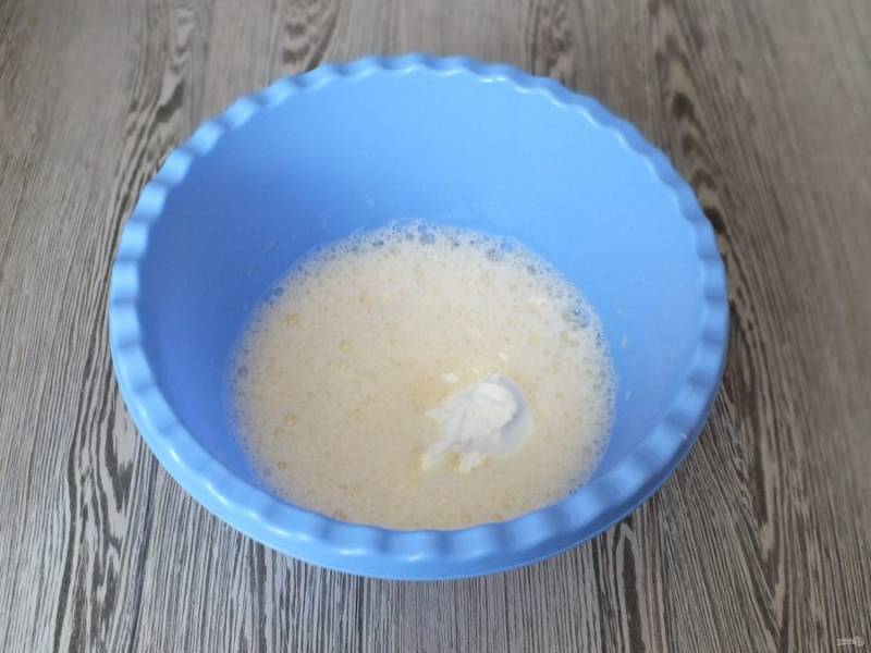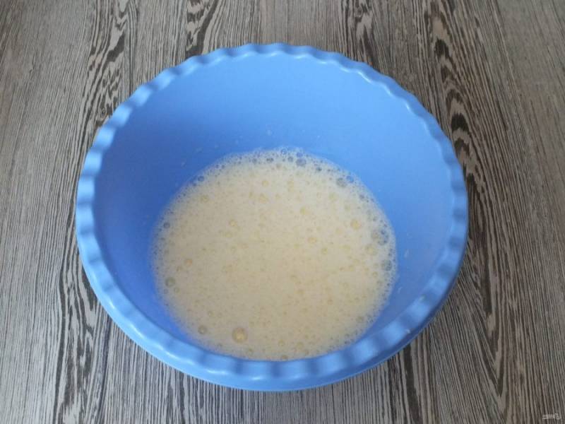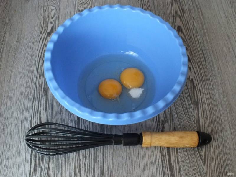 В чашу разбейте яйца, добавьте сахар. С помощью венчика или миксера взбейте в пышную пену.