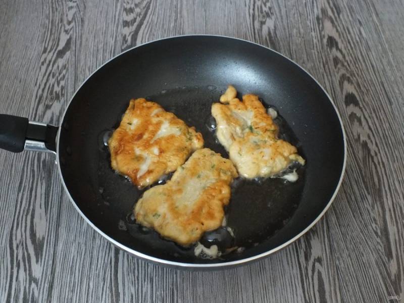 В сковороду налейте масло, слоем 0,5 см. Разогрейте. Опустите в него подготовленные кусочки рыбы на некотором расстоянии друг от друга. Накройте крышкой и обжаривайте, пока кляр сверху не схватится.
