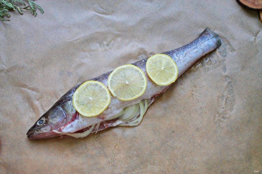 Судака посолите, поперчите и смажьте растительным маслом снаружи и внутри. Выложите рыбу на пергамент. Репчатый лук, лимон порежьте кольцами. Репчатый лук полейте соком лимона от 1-2 кружочков, перемешайте и вложите в брюшко судака. Остальной лимон разложите поверх рыбы.