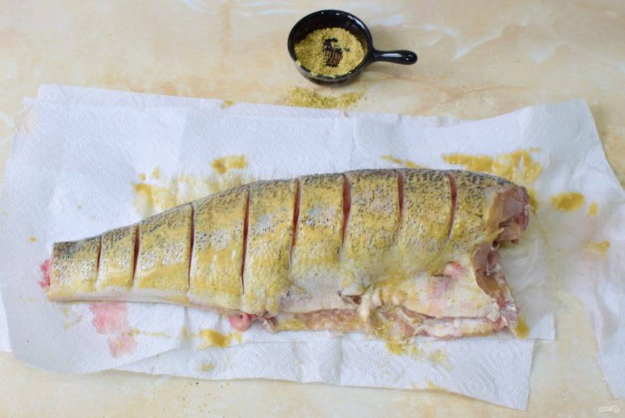 У рыбы отрежьте хвост и плавники. Смешайте в миске горчицу, соевый соус и растительное масло. Смажьте рыбу получившимся соусом. Посыпьте солью и специями.