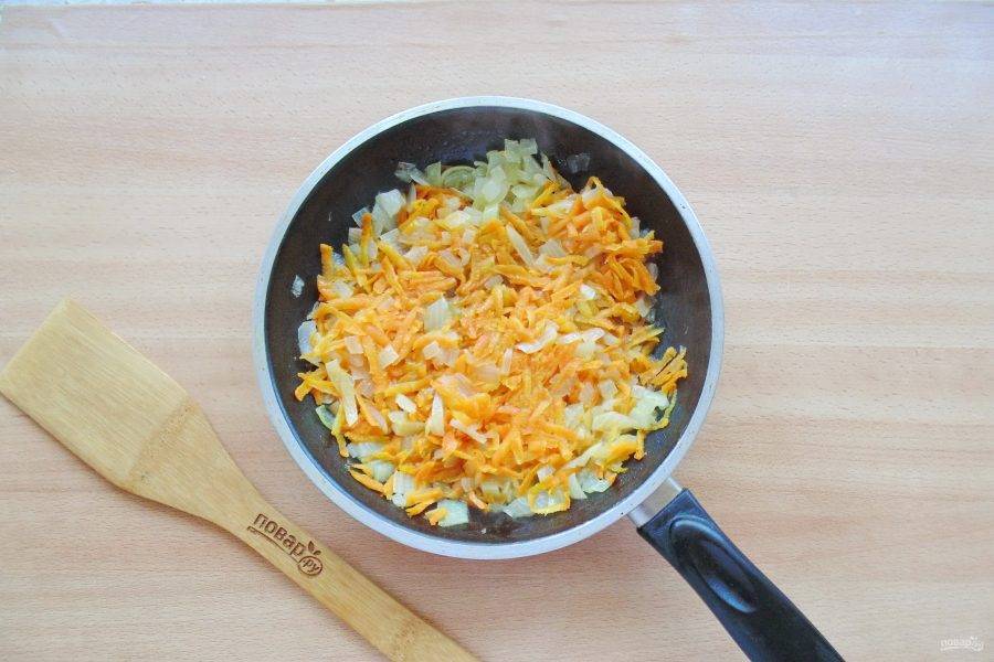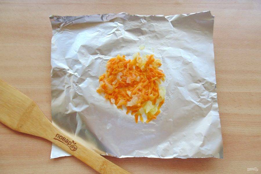 На фольгу выложите две-три столовые ложки моркови с луком.