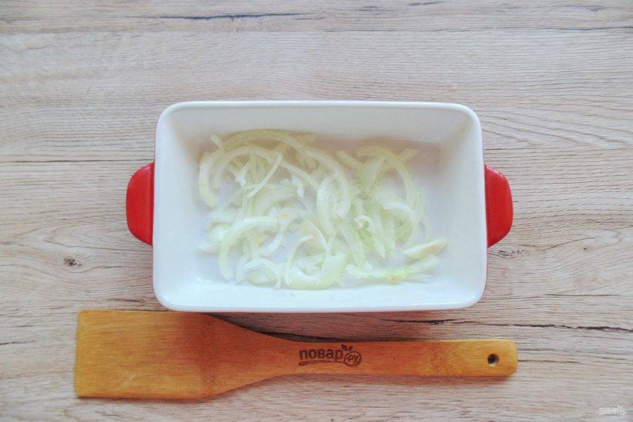 Репчатый лук очистите, помойте и нарежьте. Выложите в форму для запекания.