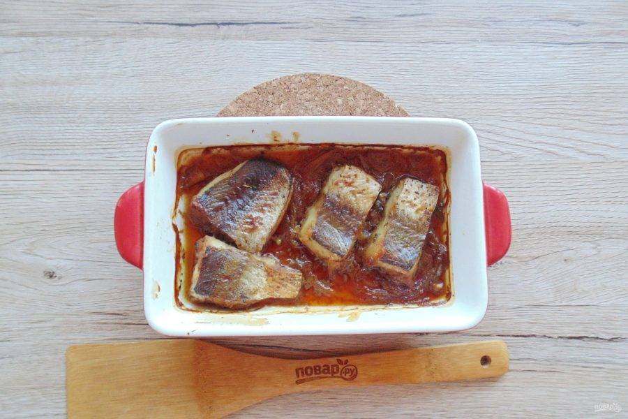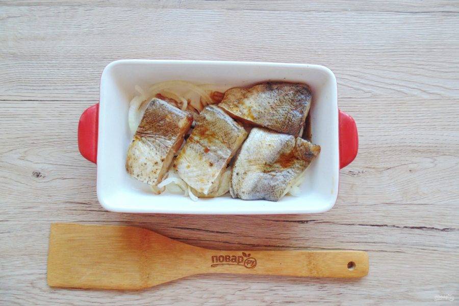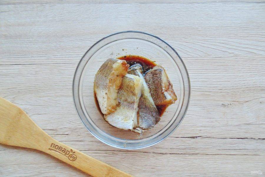 На лук выложите кусочки судака, полейте маринадом с соевым соусом.