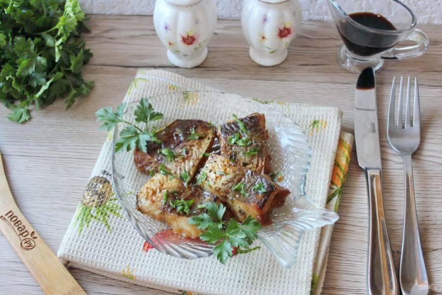 Судак в соевом соусе в духовке готов. Подавайте к столу в горячем виде с овощами, соленьями.
