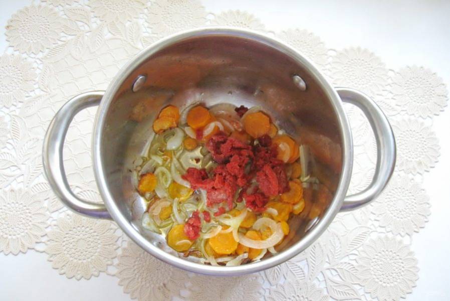 Налейте подсолнечное масло и жарьте лук с морковью на среднем огне 6-7 минут, перемешивая. Сильно зажаривать не нужно.
