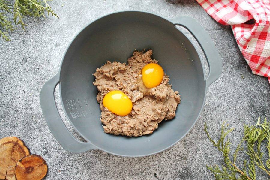 Отварную говядину порежьте на куски и дважды пропустите ее через мясорубку. Разделите яйца на белки и желтки, желтки выложите в мясо и хорошо перемешайте.