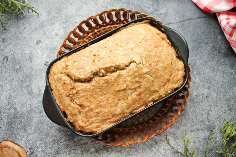 Форму для запекания смажьте маслом и при желании посыпьте сухарями, чтобы легче было достать готовое блюдо. Переложите суфле в нее и разровняйте, не приминая.