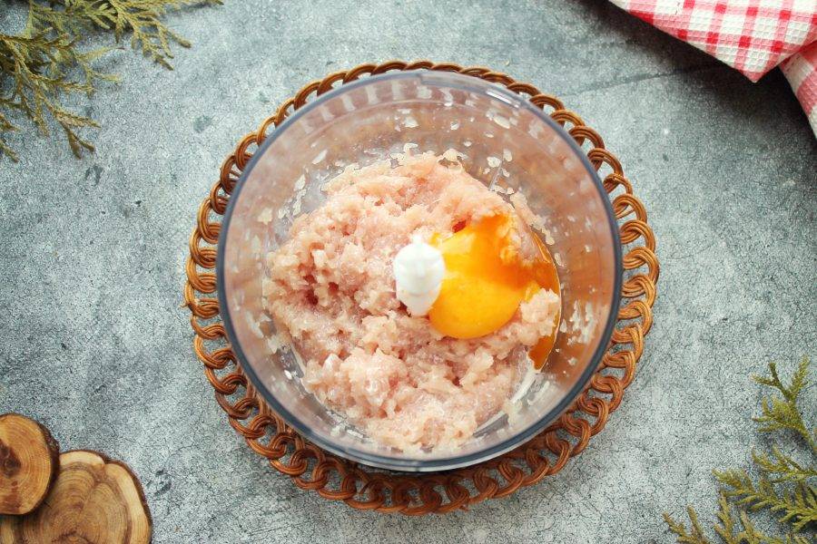 Разделите яйца на белок и желток. Желток добавьте в фарш, влейте сливки, посолите. Все еще раз пробейте до однородности.