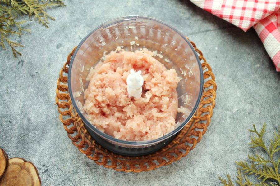 Филе кролика порежьте на кусочки и выложите в чашу блендера. Пробейте мясо в фарш.