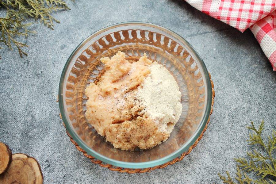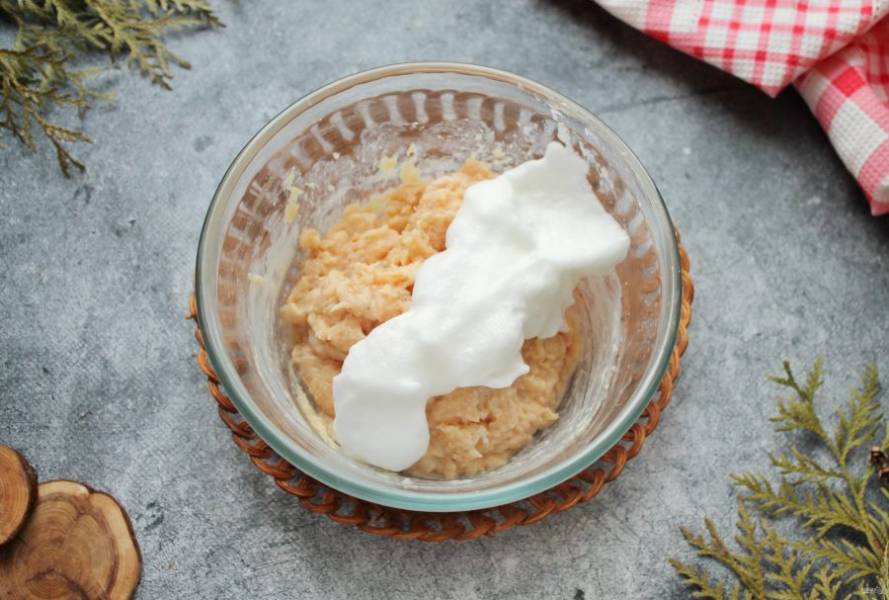 Белки взбейте миксером до пышной, плотной пены и добавьте в фарш. Аккуратно перемешивая сверху вниз, перемешайте до нежной массы.