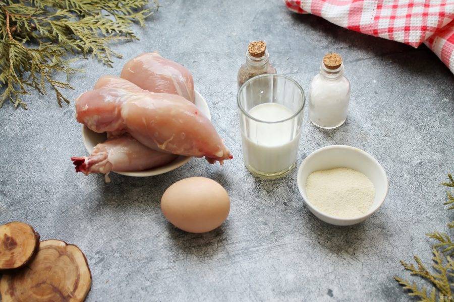 Подготовьте все необходимые ингредиенты для приготовления суфле из кролика.