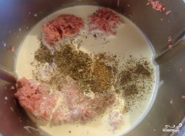 2. Затем к перебитому мясу положите следующие ингредиенты: сливки, яйца, молоко, травы по вкусу.