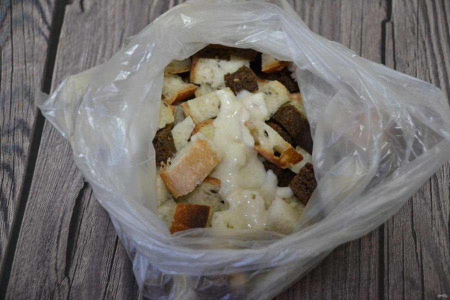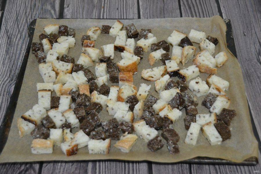 Нарежьте хлеб на кубики или брусочки, так как вам больше нравится. Выложите на лист для выпечки запекайте в течение 6 минут при температуре 150 градусов.